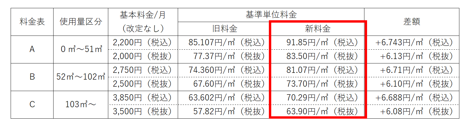 ※10月検針分に適用される料金表は、9月検針時にお知らせいたします。